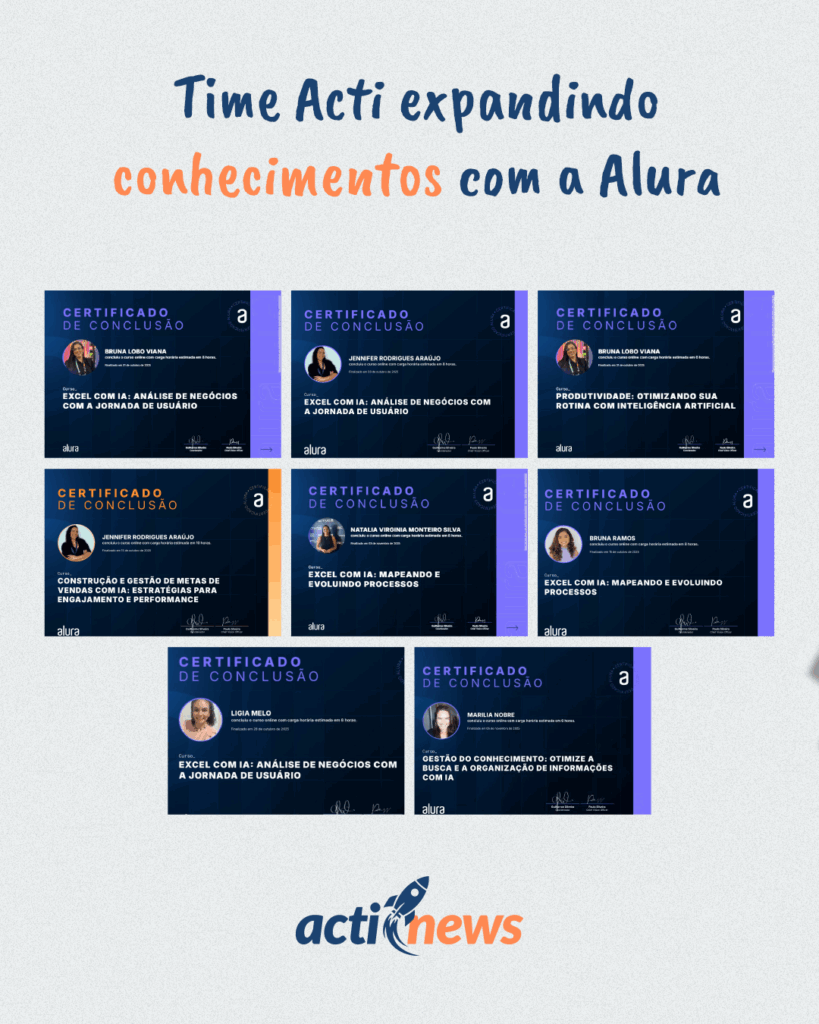 Seguindo a trilha de capacitação em inteligência artificial, o Time Acti deu um verdadeiro show de dedicação ao participar de treinamentos e cursos voltados para IA, ferramentas de trabalho e produtividade.