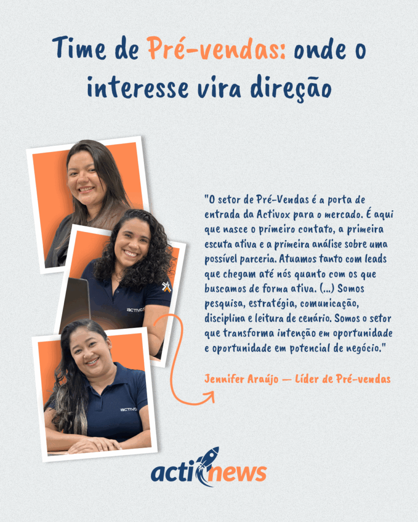 Ao longo das edições da Actinews, você vai conhecer de perto as áreas que fazem a Activox acontecer todos os dias. Nesta edição, o destaque é para o time de Pré-Vendas, o ponto de partida entre o mercado e a Activox, como define Jennifer Araújo, líder da área: