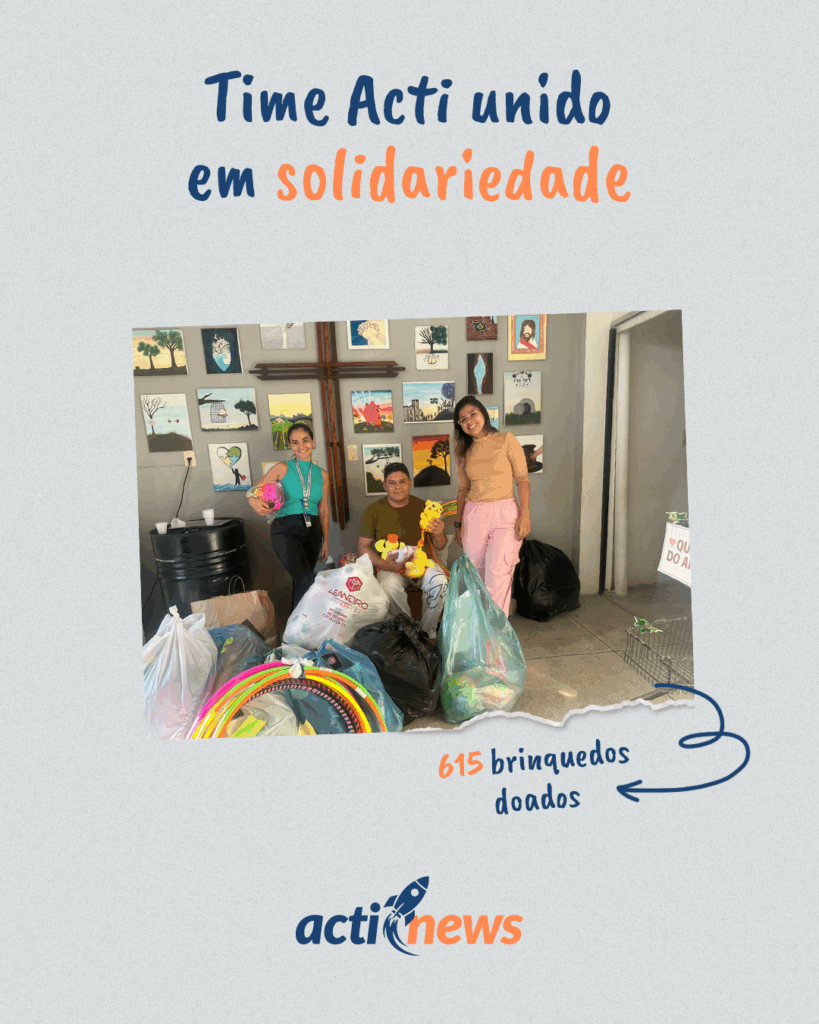 Além das comemorações, o Time Acti mostrou que a solidariedade também faz parte da nossa essência. Durante o mês das crianças, realizamos uma campanha de arrecadação de brinquedos que mobilizou todas as áreas da empresa, das operações às equipes de apoio.